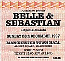 BELLE AND SEBASTIAN: Manchester Town Hall, Sunday December 28th, 1997. There’s angels in the architecture and they’re making heavenly music. Driving into and through Manchester for the first time I’m struck by the similarities to Glasgow, both in the Victorian architecture and in the street geography. At once it feels like a city of dreams, and the story of the Manchester Town Hall being chosen as the venue for this show as a result of an early morning road trip by members of the band sparked by boredom makes perfect sense. Arriving in the venue, there is instantly a feeling of delighted celebration similar to that which suffused the Union Chapel in London during the summer, and if the building sense of expectation is less here, it is probably more to do with the lack of uncomfortable pews and Glasgow Central drunk poets as pre show entertainment. Instead, pre-Belle delights are served by Future Pilot, whose Sushil Dade led antics are not altogether accidentally missed. Once bitten, twice shy, after all. Belle and Sebastian are sometimes dismissed as being music for angst filled young men (usually by angst filled old men in music papers), which is to altogether miss the point. For here, as at Union Chapel, there are many young smiling faces in the audience for whom the delight of Belle and Sebastian is not in some introspective existentialist pain, but in the way that Pop can soar and touch the inner stratospheres of the psyche. Except they’d probably just say that it sounds fucking great, which is the point of course. Because they do. They sound great tonight, which is a relief after the by-all-accounts shambles of the Saturday show and, to a lesser extent, the matinee. They open with ‘Modern Rock Song’, and promptly display their heritage of classic Pop restructured by sounding uncannily like The Velvet Underground in 1969 meets The June Brides, which, in case you’re wondering, is No Bad Thing. They follow this immediately with a similarly Velvetsy take on the already classic ‘The State I Am In’, and already it is clear to those who didn’t already know, that we are witnessing the sort of Pop dream that comes from somewhere beyond the pale and that touches only infrequently upon the ground we call the real world. And then, as if to prove these sentiments entirely idiotic, they stop. For ten minutes, whilst a Cello doctor is sought to fix the problems with Isobel’s cello. People shake heads, and brows furrow. I see people walk away, out of the hall, clearly unimpressed. And yet it is this very segment which, to me, cements their worth as a Pop group of indefinable magnificence. It is also a moment which polarises opinion and leads to extended arguments regarding professionalism and the perceived responsibility of the Pop group to adhere to certain traditional roles. Which, to me, is what Belle and Sebastian are all about, and that is, questioning and challenging the entire process of being a Pop group in the late 20th Century. I’m not saying that the ten minute gap was planned, but it is the fact that the group can take such risks (how many Pop groups can you name me who take cellos and violins and trumpets and all sorts on stage and make it sound like an amplified Pop orchestra?) and can make the breakdown of the risks feel comfortable and warm that marks them out as special. I am not celebrating incompetence, but rather I am celebrating the way in which the artist can accommodate accidents and weave it into the tapestry of their work. And in such a light, we get Stevie Jackson entertaining us with an impromptu take on ‘Matchstick Men and Matchstick Cats and Dogs’ which is as amusing as it is embarrassing, and a demonstration of the similarity between the riff of ‘le Pastie De La Bourgeoisie’ and the theme from Emmerdale. We also the chance to look at ourselves. Think about it... All that said, however, the extended pause seems to sap concentration, or heavenly karma or whatever, because when we start off again with ‘le Pastie’, something of the spark has gone. It’s not that this, or the usually perfect ‘Seeing Other People’ and ‘Get Me Away...’ which follow sound bad (indeed, it is the songs from ‘If You’re Feeling Sinister’ that generally sound the least convincing tonight), just that they lack the sparkle of magic dust that we have already seen them to posses.. Things are set back on track however, with the already classic and as yet unreleased ‘The Loneliness Of The Middle Distance Runner’. From it’s opening "I’ll take a second of the day to think about the things that we have done this year..", the song feels for me to be a pinnacle of 1997. I know I am eternally lucky to have had this song as accompaniment to my life since the summer, yet even so it hits me like the first time still. It spirals out into the night air and I can hear my heart fluttering. Speaking of heartflutters, an even larger one comes next when Isobel steps up to the mic and the strains of Orange Juice’s ‘In A Nutshell’ creep across the tracery of the Town Hall ceiling. Belle & Sebastian seem to perform cover versions with almost the same irregularity as they play shows, and choose and deliver them with such amazing class and poise that I can only stand and dumbly grin at the perfection of the reference points. I am genuinely transfixed by Isobel as she sings, backed by Stevie’s magic ‘sha sha sha’s, and I find myself hoping that everyone here will at the very least determine to go and discover the original for themselves. It’s on ‘You Can’t Hide Your Love Forever’ or the magical and near mythical ‘Ostrich Churchyard’. Further delight is had at the airing of a new song, ‘I Know Where The Summer’, ‘She’s Losing It’ from the criminally unavailable ‘Tigermilk’, ‘Seymour Stein’ and a ‘Century of Elvis’ which has Stuart David seeming to forget to read much of the story despite reading out of his notebook and Stua