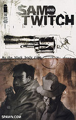 | Much better is Sam and Twitch, which I bought four editions of. The drawings in here are good, though not as good as the blurred, moody covers, and the storyline witty and surprising. Sam and Twitch are private detectives trawling through New York, which gets a good look in as background, and I like the whole cynical smartarse tone of the story, though, of course, I've ended up with the last three issues of one story, and a single issue from a new plot. But the framework is slick, the drawing inventive and I'm tempted to order the complete thing on the net as I see Amazon say it's publication is imminent. Best of the bunch is the graphic novel Tell Me, Dark, a horror story set in and below London. Tangents readers will know all about my city-fixation: that and the dreamy, textural soft-focus art soon persuaded me to purchase this. It manages to combine Baudelaire quotes, sex, love, the subterranean and demonology with liberal views of the dark corners of London - many recognisable - into an intriguing tale with a nice final twist, where not all is as it seems. It almost persuades me that there is life in the comic world after all. Almost: for elsewhere I found com-x's Issue #Zero, a sampler featuring original specially-drawn self-contained new comics by the best of British... blah blah blah. A quick flick in the shop, and the desire to find something new, and I bought it. Closer perusal at home means that even I, non-expert comic reader, can recognise Heavy Metal magazine rip-offs like 'Heavy Plant' [nicely drawn though... especially the gouache work on the intro spread]. And why does the world need another big-breasted violent woman superhero[ine] like 'Bazooka Jules'? I mean, come on, the inherent sexism and masturbatory fantasy that produces Lara Croft is bad enough; Bazzoka Jules [fnar fnar fnar] is simply sad - an adolescent anatomical disaster combined with the unsubtle violence of late 1960s Commando magazine. If this is the future of British comics then rag-mags are the new literature. Sad, sad, sad. |