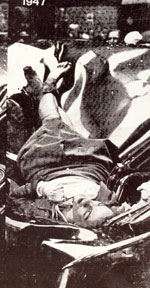 The Death and Disaster paintings could also be read as religious, and they are my favourite of Warhol's screen-paintings. They are my favourites partly because I love the colours of the '5 Deaths' car crash pieces, but also because they do such a great job of confusing the issue of the importance of the subject. Sure, the paintings are about the morbid fascination humanity has with death and disaster, but they are also about nullifying that fascination through multiplication. When he painted the multiple Mona Lisa's Warhol supposedly said 'thirty is better than one', but he was also saying that the multiple strips away the individuality, takes the uniqueness of any given thing and tosses it aside. So through the multiplication of the frozen moment the Death and Disaster paintings similarly toss aside all notions of humanity and leave only abstract form. Only a wraith like after meaning of the moment itself remains, like the ghosts of those nameless victims forever frozen in time, doomed to haunt the Art galleries of the globe forever and a day. All of which means of course that The Death and Disaster paintings are about that sense of detachment, of distancing oneself from the disquieting and violent contents of the world. It's perfectly captured in the 'White Burning Cars 1' painting of 1963, in which car crash victim Richard J Hubbard hangs impaled on a spike on a telegraph pole in a Seattle street. In the background another man strolls past on the sidewalk, hands in pockets, seemingly oblivious to what is happening only yards away from him. That enormous emotional distance in the source photograph is indicative of the emotional detachment Warhol was striving to achieve through his paintings. You could say that such distance is essentially a religious distance, and that Warhol's life and work can be seen as a religious journey. There's a sense of Warhol striving to stay somehow pure through his work, wanting to keep his distance from emotion and from human connectivity. It's as though he senses that it is through emotional connection that the road to pain and ruin lies, and whilst he wants more than anything to avoid this, he cannot help but be attracted by it. Warhol's work, his life, is as much about this conflict as anything else; he's using his very deliberate detachment as his means of staying devoutly religious, at least in his eyes, or in the eyes of his work which is much the same thing of course. So much of Warhol's work gives the impression of someone desperately interested in the weird and wonderful machinations of the human psyche, but also someone who has a deep seated religious fear of recriminations at the Pearly Gates, so that he does not allow himself to be drawn into the actions of the world, but instead lives vicariously through his voyeurism of others. It's unknown, of course, in what light Warhol's God ultimately saw such (in)actions... My second favourite of the Death and Disaster paintings is '5 Deaths on Turquoise' simply for that colour, but my absolute favourite is the large '1947 - White' painting. This painting repeats a photograph of a 23 year old model who jumped from the 86th floor observation deck at the Empire State building and landed on the roof a car. It's a remarkable image; the beautiful young woman cradled in the metal of the car's roof seems almost to be asleep and recalls Millais' Ophelia, drifting downstream in her strange restful repose. It's really quite beautiful, as much for the erasing of the meaning in the subject as for the obvious (if oddly warped) beauty of the subject matter itself. There's a school of thought that says Warhol's work was much less interesting after his shooting at the hands of Valerie Solanis, and whilst there's occasional truth in that stance, it's also, thankfully, flawed, because Warhol produced some fantastic work in the 1970s and '80s which explored his role as a painter much more than before. |