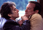 | When a schoolgirl is murdered in a small Alaskan community LAPD detective Will Dormer (Pacino) and his sidekick Hap (Donovan) fly in to investigate. Beautifully shot, in a wry setting, Christopher Nolan's follow-up to Memento is about living with past actions, when those actions make you act in ways you wouldn't desire. A lie leads to more lies. Can the end justify the means if the means betray your character (and risk your reputation)? The disorientation of Alaska's 24hr sun makes itself felt. Feet slip on cobbles, phones awkwardly fit into receivers, and Pacino has to cover his tracks in an unforgiving glare. So far so good. Memento didn't engage me. A one-trick pony, well-executed, I didn't empathise with the protagonist (for many this was its greatest strength). The characters are stronger in Insomnia. Pacino conveys how it feels to be f°ted and under the spotlight when you aren't free to be yourself, under false pretences. He's already not himself when admiring local cop Ellie Burr (Swank) asks him questions - lost behind a fog of faces and exhaustion. Pacino looks good in leather jacket, his face the cigar smoker's ruin. His performance is not as OTT as in Any Given Sunday although he does erupt occasionally. The against-type Williams is also excellent, his naturally friendly face like a sedative tempting Pacino into acquiescence. Ultimately, though, the film doesn't let us see Pacino come to terms with his actions. Far better for him to take the consequences. And I wonder whether the conversation between Williams and Pacino was recorded on answerphone. This would have enabled Pacino to confess all and prove he had met with Williams. Final scenes that mirror Pacino / Williams and emphasise Williams as mentor to the deceased admiring girl and Pacino mentor to Burr are overplayed, while Burr is left to make her own decisions. And we've been here before - Pacino's rapport with the killer (Williams in best 'Agent Cujon' voice), meeting the killer in a public place (this time a boat rather than a café), while the teenage lover's necklace and starkly beautiful backdrop are sheer Twin Peaks. It would have suited the film to draw out the repercussions the way it found its own pace throughout; but then our lives are rounded with a sleep. © Matt Bryden 2002 |