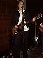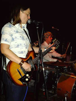 Saturday I wake up clasping Larry, my nose in his leather jacket. It smells approximately like the rabbits he keeps. We get dressed to go shopping for mainly soul records. At the bus stop, a young girl removes a samurai sword from its sheath and looks to her boyfriend for acknowledgment. "Did I do well?" It confirms suspicions that Brisbane glimmers weirdness. On the way back to the hotel, Marc spots a crippled dog hobbling across the road. "Hey what does that dog have gaffe tape on its leg for?" "To hold it up," replies Mia. "What to hold its leg up?" he shrieks. Back to the hotel for a rest and then into the city by four o' clock to shake some ass, as New Estate rock the afternoon slot at Ric's Café. The band arrive wearing spiky, studded armbands. Marc's bracelet — with its long, metal spikes — are especially worrisome. How he will manage in the bathroom one shudders to think. The band has to play a little quieter for this gig and they deliver a serene set of calm beauty. After the show, we head straight to The Jubilee Hotel, a 10-minute walk up the road where the tables are shaped like capsules. After delicious fish and chips, we move upstairs. Here we gather around a table on the balcony to drink beer. Here too, a flannel-clad local pretends to throw up on the throng walking to Sonic Youth, who are in town and performing down the road. Then the guy did it for real in the corner of the balcony. Then he sat down and did it in his lap. His friend, who resembled a dreadlocked Gary Oldman, seems to have seen it all before — he yawns into his beer. After assuring us he would not perform, Pat picks up an acoustic guitar and wanders through a lovely set of tunes. Up next, the glorious Pits give us sunny folk rock gripped by dark undercurrents. Led by a lordly little fellow, Peter Pits, exuberantly gay, unassumingly rock, it was like watching Buck Henry front the Velvets, circa ‘69. The noise New Estate make at the Jubilee Hotel is unearthly loud and the approach is one of musical rebellion. Larry is the engine room and the conductor. As usual, he is operating beyond the clutches of vanity. His belly pops out of his shirt, making it available for audience perusal. He flashes a shit-eating grin to the others like Levon Helm in The Last Waltz. ‘Defences Down’, Larry's falsetto-driven tour de force love ballad, finds him taming his inner Shelly Winters, while Mia and Marc duel Marquee Moon-like guitar elegies. Next Mia sings a devastating rock ballad called New Start that's punctuated by soaring Echo and Bunnymen guitars. Mia has an ear for a tune like no other, and can dash off a gem with stunning caprice. Marc Antonio sings and plays guitar too, except Marc does it like he's got the weight of the world impaled on the neck of his guitar, which most of the time he does. Marc dresses songs about life's ongoing mysteries with blazing rock and roll melodies. During his new one, ‘Wasting Time’, I totally see what Brad would later claim, over a round of rum and cokes, as being Marc's gift, an instrumental prowess that puts him next in line to the throne of Ed Kuepper or Beethoven. The band blows into his tune with messy modern rock elegance, while Marc supplies a weird kind of ferocious country strut that knocks drunks into greater stupors. Brad plucks his bass eagerly, his square-jaw tense, determined, his hair gleaming moodily like a Tasmanian pinot. The Cosier-penned ‘After it's all over’ is an instant soul classic, abetted as it is by a double platinum Reguiero riff. Their next LP is really going to kill. Larry and Marc Antonio swap instruments as the night degenerates into a crazed psych-out. As I watch Larry bang away exuberantly on one meaty chord and howl, time shifts forward and suddenly we're back in Melbourne, and here is Larry, stale from a Brisbane flight, heading to his front door minus his corrective foot insoles. He is hobbling and looking slain. "He will go to bed in an hour and sleep for five days,” observes Mia from the passenger side window. "Well does he have to be anywhere anytime soon?" asks her husband. "Yeah, we're recording on Saturday." © 2004 Shane Moritz |