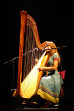 a little too trad, dad. Alasdair Roberts certainly has C in a froth: ‘My grampa used to do stuff like that’ she says, ‘only with more life to it’. And again she has a point. But in spite of the traditional Scots content and delivery, I grow to rather like him. I think the striped bare almost slow-core acoustic delivery is what makes him apart from the norm this is folk music laid bare, taken back to its roots. It’s not full of some jaunty, romanticised re-branding of a past that never existed in the first place, but rather is full of death, despair, loves lost and murdered. Not that I particularly want any part of it in my life beyond the short span of his set, but there you are. Then there’s Joanna Newsom, as naturally strange and gifted a singer/songwriter as you’ll find anywhere in history you care to look. Apparently mad as a cheese and deliciously precious because or despite of it (it depends on which day you catch me), she’s the kind of artist you can never quite pin down. Sure, some of her songs are populated with the kinds of fairy tale imagery of the most rightly reviled hippy queens of yore, but somehow it’s okay. Somehow it feels Right, and it feels Right because it feels instinctual. Joanna Newsom is like one of those flighty girls who are perpetually forgetting their homework; is one of those girls who toss their hair and disappear in a flurry of dream-eyed visions of unicorns; is a peculiar out of time re-incarnation of pre-Raphaelite beauty standing oblivious to the 21st Century on the steps of monolithic concrete landscapes. She’s apparently out of phase with the rest of the world, but somehow that just throws the rest of the world into sharper focus, She makes the world stop, spin backwards and around on her axis. It’s really quite dizzying. And of course there’s the harp. On record it lends her songs a quality that harkens back to the likes of Young Marble Giants, and that’s no bad thing. There’s a danger however that it’s going to be her undoing: “Joanna Newsom: the bird with the harp”. Is that all we’ll remember ten years down the line? It shouldn’t be. Certainly the songs transcend the instrument, proven tonight by her spending much of the set at the piano, courtesy of the blisters caused by the previous night’s show in Bristol. They are songs that shimmer and quiver, that swoop like swallows in the July sun, turning on a sixpence and spearing for the heavens on a wing and a prayer. They are songs that challenge and delight, that smooth the rough roads and that leave scratches in the glass. There’s naturally a creeping temptation to mark Joanna Newsom out as a momentarily fashionable aberration; one of those peculiar conduits that manage to cross genres and briefly connect the worlds of the worthy ‘serious’ music of the academics and the more transitory world of rock and Pop. But she is better than that. She is better than that because she seems to be one of those rare genuine mavericks, one of those artists who will continue to develop in strange and naturally obtuse angles, in or out of the spotlight, simply because they know of no other way. There is no artifice in Joanna Newsom, no studied ‘difficulty’ or academic cleverness. At the risk of coming over all hippy, there is just the sound of a free spirit reaching inside and out for the marks and gestures to explain itself and the world it finds itself journeying through. And I for one am intrigued to see where that journey leads. © 2005 Alistair Fitchett |