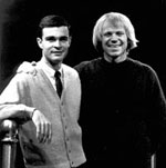 to be. Hullabaloo mostly featured bands miming (often the singing was live over prerecorded backing tracks) to their hits and inane show biz type medleys of the current top 10 by the host and whatever musical guests were on the show. The Byrds singing part of "Do You Believe In Magic" is one of the more bizarrely entertaining medley segments with McGuinn radiating sarcasm. Gee I thought Crosby was supposed to be the asshole. I guess Crosby was the creepy one. I know traipsing through the gardens of his mind and his salacious come-ons in "Triad" always gives me the heebie-jeebies. Ah, potshots at David Crosby are too easy. Anyway at least Gene Clark (aka the most talented of the Byrds) did not disappoint, looking completely sincere and sweet throughout. The absolute worst episodes of Hullabaloo occur when Barry "Eve of Destruction" McGuire drops in, as he can't seem to help but mug it up in truly gruesome proportions; painful grimaces, smiling way to wide at nothing in particular, and peppering everything with inappropriate maniacal laughter (as opposed to appropriate maniacal laughter). Reminds me of this line that R. Meltzer has in the Aesthetics of Rock; "the delivery of Eve of Destruction is so overwhelmingly affirmative that the overall effect is that of rendering Weltschmerz cool." I don't mean to put the show down, as there are some good moments and good guests. It's a truly odd mish mash of stuff and the over all feel is one of disorienting kinetics, a desperate stab for a good time happy feel careening off the tracks like a housewife's descent into amphetamine psychosis from one too many diet pills. |