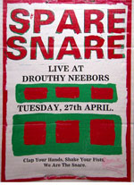 ‘Volume For Poetry’ is prettily eerie. The poet Anne Stevenson is sampled reading over a gentle instrumental, which really works to enhance her evocative, rich voice. This is particularly successful as she introduces a series of poems based on letters written in the nineteenth century informing us that ‘none of these people are living’. The submerged sounds and voices in the music give it a haunting, ghostly feeling. ‘Trees And Horses’ mixes folky picking with Eastern drones and an impossibly high vocal. ‘In The City’ begins with what appears to be a treated, pre-programmed beat, building up from the most rudimentary of musical sounds with a clipped bass line and discordant vocals to fashion something inventive and new. It manages to sound fragile, fractured, discordant and defiant at the same time with curious backing vocals deep down in the mix. What initially sounds messy and throwaway soon reveals itself to be a cleverly layered and structured song that has a passing acquaintance with an earlier Spare Snare sound. ‘Come Back Home’ is built around an accordion, ukulele and acoustic guitar. It sounds quite scary, the voice almost cracking, deep, dark and measured over a sparse but hugely effective backing. Obsession, loss and love are all contained in lines such as Can I have you back now? There’s an overwhelming intensity contained in this short song, it sounds totally torn apart yet retains a sense of beauty and integrity. ‘Air Miles’ is slightly lighter with its loping, looping bass line, sturdy rhythm and upbeat acoustic guitar. It feels as though it is going to collapse in on itself in the middle but survives until the end. The lyrics combine humour with serious intent to lighten the mood after ‘Come Back Home’. ‘Xerox Darker’ heralds the return of the accordion, with an extended instrumental accentuated by gentle picking. The vocals appear towards the end, leaping in when you don’t expect them. This time the words are more defiant: How I learned to Xerox darker The delivery is quite dark, the final lines and discordant keyboards seem to combine to offer a sense of (misplaced) resolution but the final song ‘Grow’ is more positive. It’s very intense and uplifting, both musically and lyrically. The lyrics talk of stepping back from unwinnable fights (MacDonald’s is alluded to in the opening line) to make a space where ‘I’ll cut the grass / And grow myself’. If this sounds a little hippyish then don’t worry, this is still a ‘punk-pop’ album. ‘Grow’ is a lovely finale to an album that can often feel pretty dark and intense though there is a lot of light and shade spread over Garden Leave’s twelve songs. From days out in the country (‘Field Trip’) to settling down there (‘Grow’) Garden Leave makes quite a journey in its short playing time. The album has a really organic, raw feel to it, there are moments of discord and brittleness but it is also warm, intimate and beautiful. At times you feel as though you are listening to someone’s most private thoughts, an unsettling internal monologue,, at others you enjoy the story unfolding. Not one song sounds out of place, nor do they ever outstay there welcome. Quite often I find myself thinking the songs are too short and, coming out the other side, take a deep breath and jump right back into the world of Garden Leave. This is another accomplished superb record. Bigger than the Beatles? I don’t care and I suspect Spare Snare don’t either. All I care is that they have been one of my consistently favourite bands for more than a decade and they could be yours as well! How far we’ve travelled together and over such a distance. Hopefully some things will never change. © 2006 Andy Wood www.wearethesnare.com