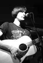 Which leaves the Left Outsides. Of course I am biased, having released their ‘Leaving The Frozen Butterflies Behind’ EP way back in January (jeez, time flies and all that malarkey), but nevertheless it is Left Outsides who sound strangest and most magically beautiful of all the groups tonight. Performing for the first time as a four piece, the addition of bass and restrained Velvetsy drums really brings out the psychedelia that underpins the Left Outsides. Theirs is the gentle, folksy psychedelia of chilly English fields at dawn with ghosts of perfect Beat boys and girls wandering hand in hand with heads full of Vashti Bunyan songs and Stanley Spencer paintings. Which means this is not the psychedelic sounds of the obvious offenders. No Day-Glo paisley patterns projected in interminable guitar solos, Left Outsides instead paint with carefully measured strokes in limited palettes of muted blue and green. It’s the difference between a Cream and a Sagittarius, and it’s all the difference in the world. The interplay between Mark and Alison is the key to their magic. Their voices settle softly into the mix, often barely audible but always pure and serene. Alison stands statue still in classy vintage dress, gazing into the middle distance of forever, conjuring comparisons with Trish Keenan or with Alison Statton. Her viola hovers somewhere between John Cale’s droning squalls and Francis Sweeney’s melodic squeals, and that’s a mighty fine territory to be treading. Mark meanwhile caresses a guitar and hides beneath a perfect bowl cut, every inch the clued-in outsider. And naturally these things are important. How much more thrilling to see a group make an effort rather than to peddle the tired dress-down indie stereotype. Those words of Kevin Rowland ring down the years with such relevance still, which is scary, sad and scintillating all at once. With a wealth of experience behind them already (notably with Saloon and 18th Day Of May) The Left Outsides are a group who, although they know their chosen aesthetic inside out, are not afraid to mould it into new forms. Catch them when you can. © 2006 Alistair Fitchett