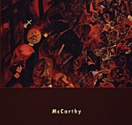 ![]() | With his next McCarthy sleeves, Royston followed along similar lines, taking the key artistic movements of the early 20th century and applying them with both wit and an obvious pleasure. For the debut McCarthy LP I Am A Wallet he used a painting by German Expressionist and Dada member George Grosz. The sleeve made no attempts to divert attention from the power of The Funeral Procession, fitting a small, sans serif typed band name beneath the painting on the front and a similarly simple use of text on the back, where the layout was essentially the same as used on Unseen RipplesÉ. The record insert, in black and white, followed the same layout rules as the coloured sleeve: on the front a photograph of the group at the end of Downing Street sat in place of the painting, whilst on the back the track listing was replaced by personnel credits. |
